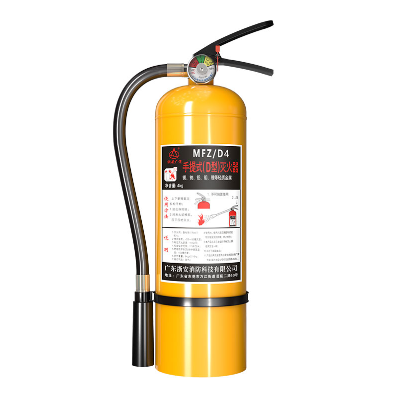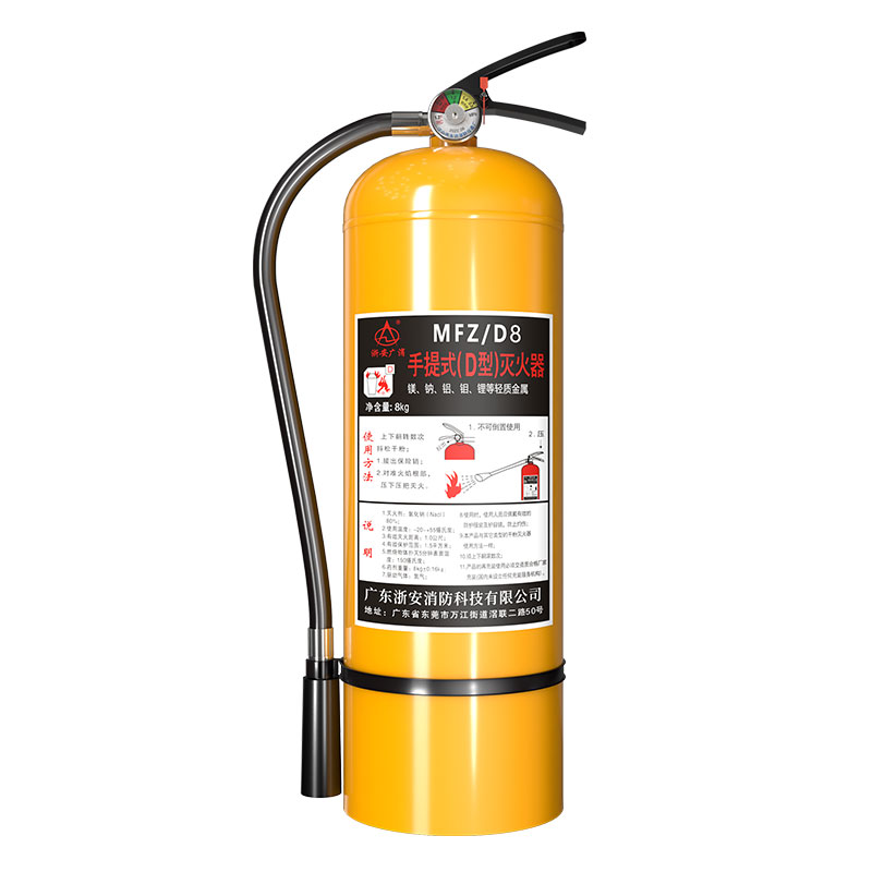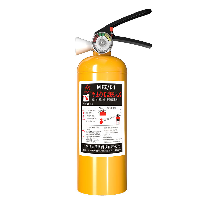 D型灭火器是一种专门适用于扑灭轻质金属灭火器、如:镁.钠、铝、钼、锂、钾。碱金属、金属氢化物等金属有机化合物(三乙基铝、正丁基锂、三异丁基锂)的火灾。由于此类物质是属于轻质金属易复吸空气中的氧气和水分从而产生气化可燃类氢、烷气体,从而发生燃烧、爆炸。由于该类产品应有的特性所以一旦发生火灾一般的灭火器材非常难将其扑灭,特别值得一提的是一旦轻质金属发生火灾千万不能用水施救,否则将发生更大的爆料性灾难。如果一旦发生此类火灾将采用专业的D类灭火剂、D灭火器进行有效扑灭,万一没有储备该类灭火器设备可以采用沙土将其隔离,覆盖让其自行燃烧殆尽防止灾害进一不扩大。