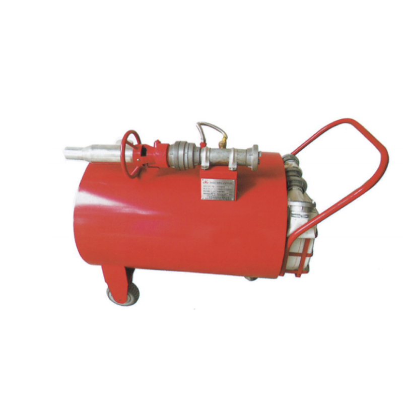 装置底部装有4个轮子,前端两个为定向轮,后方(把手端) 2个为转向轮,可以灵活转动,罐顶上装有PHF型管线式比例混合器与PQ型泡沫枪。当压力水通过比例混合器的喷嘴时流速增大形成负压。吸液管将泡沫原液从罐内吸到比例混合器中与水混合形成泡沫混合液,经过泡沫枪吸入空气后形成泡沫,对准着火点,进行灭火。